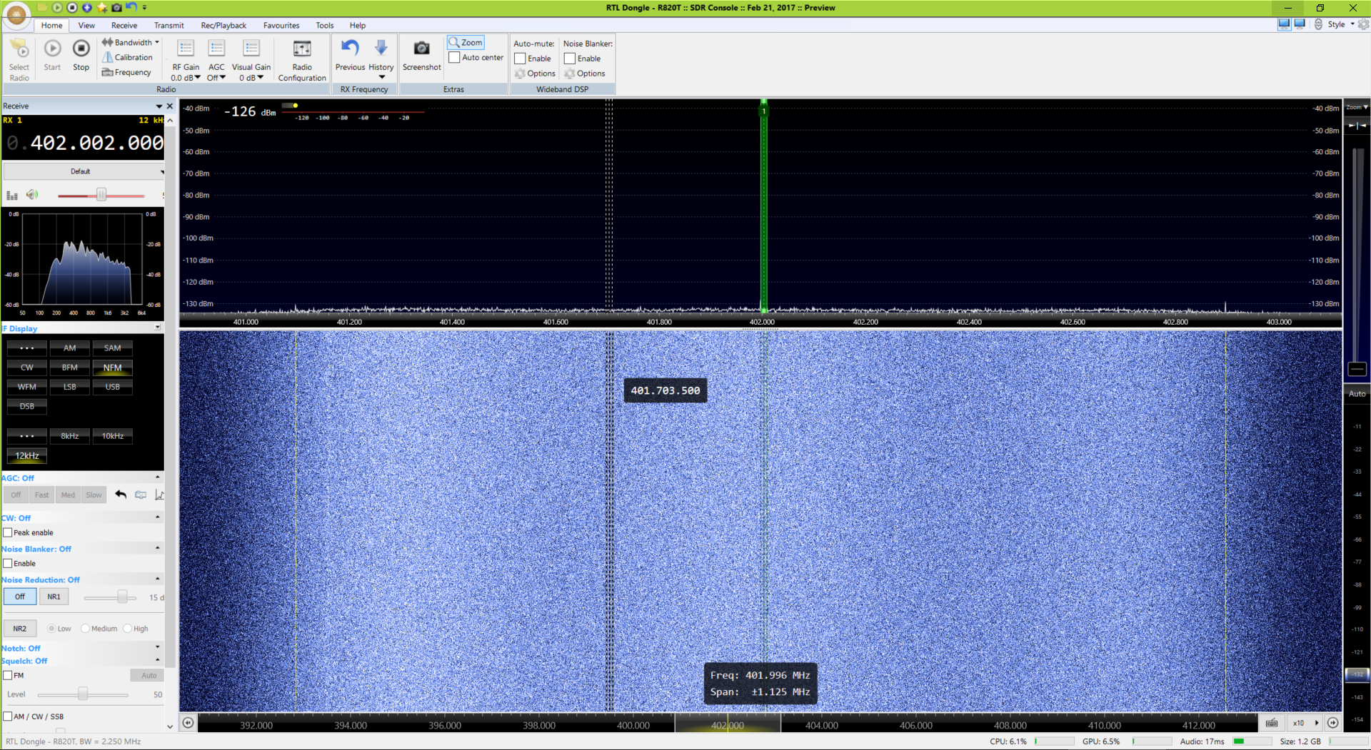 Attaching screenshots of waterfall tuning into 401MHz and 501MHz. Same noise spikes appear on both graphs.