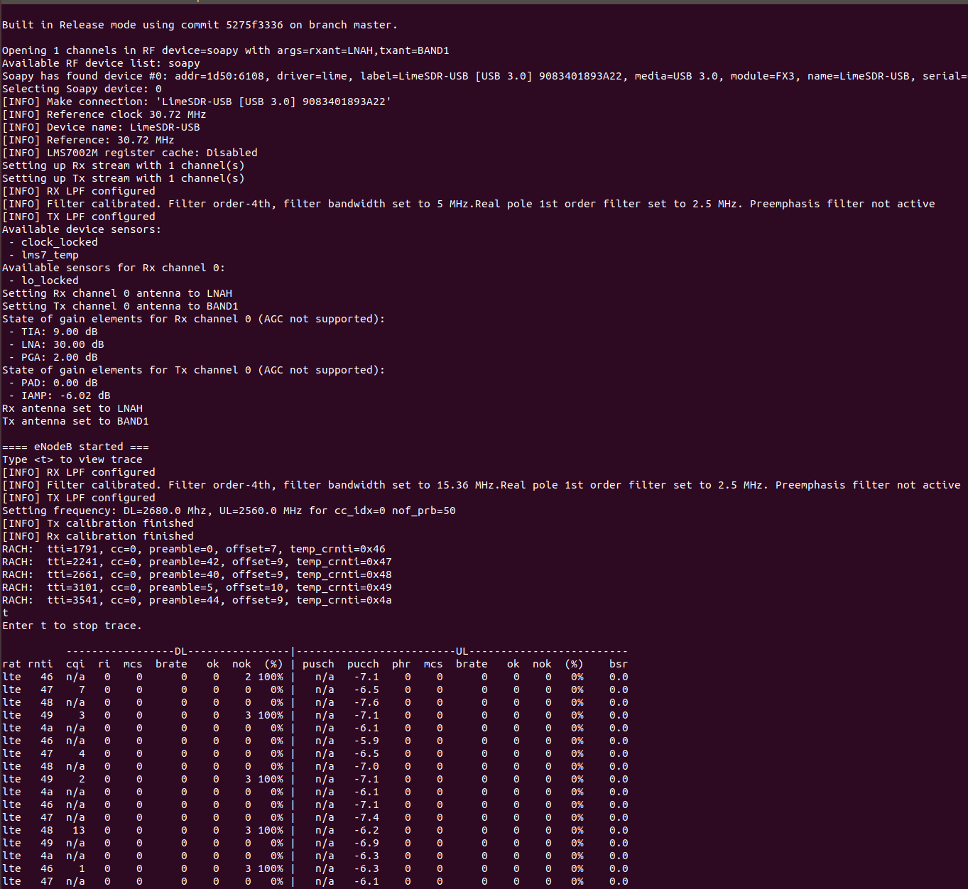 2- Use lower frequencies; LimeSDR has the highest power between 500 and 900MHz, I like to use it at 800MHz (B20) (EARFCN 6400)[use LNAL and BAND1] between 25 and 75PRBs… If you want to use high frequencies, high PRBs, you need to adjust the PPM offset (adjusting VCTCXO by LimeSuiteGUI can help) but better result; use GPSDO, but at high frequencies you will do better with an amplifier linear.