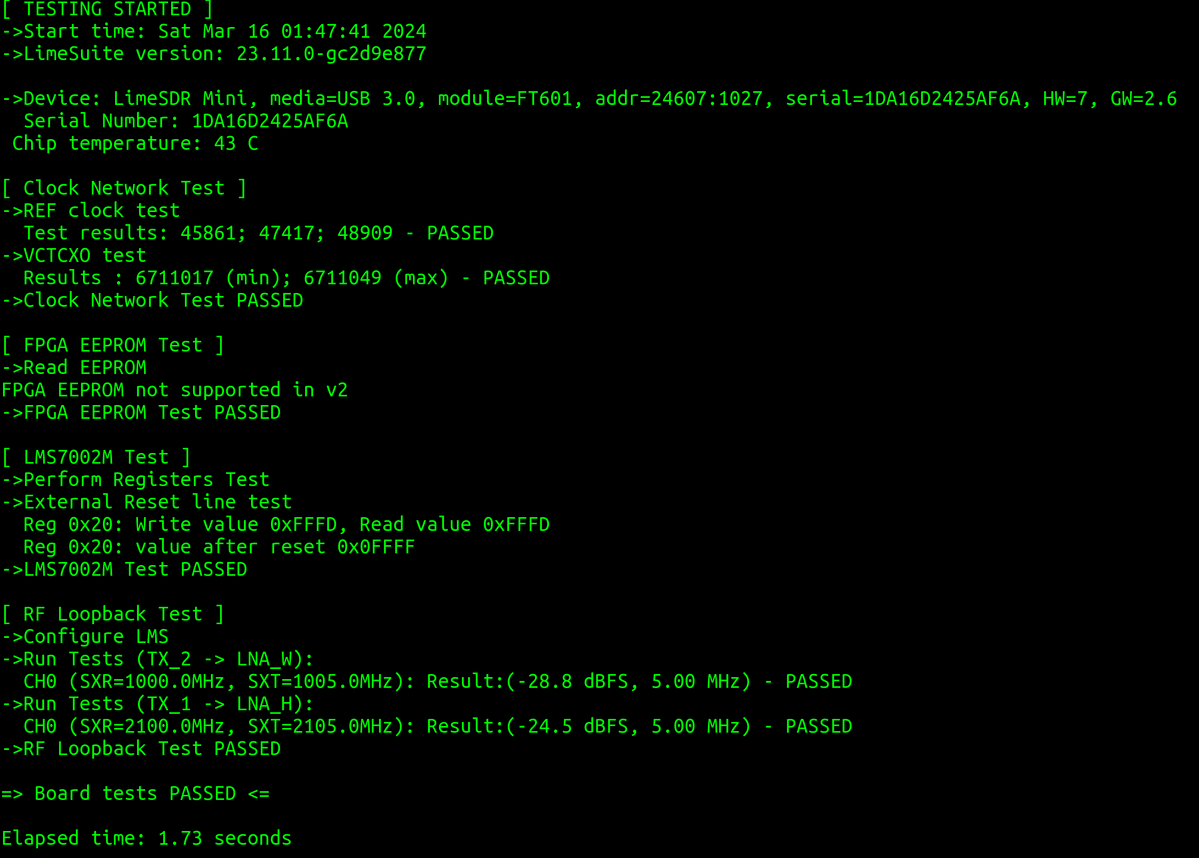 Nevertheless, connected to a USB 2.0 Female adapter that splits in Y into two USB 3.0 Male terminals, one of them connected to a power source, the other one to a 3.0 USB Female port in a Raspberry pi 4B that uses the same LimeSuite version (23.10.0), the TX_2 LNA_W Test fails, but the rest of them pass.