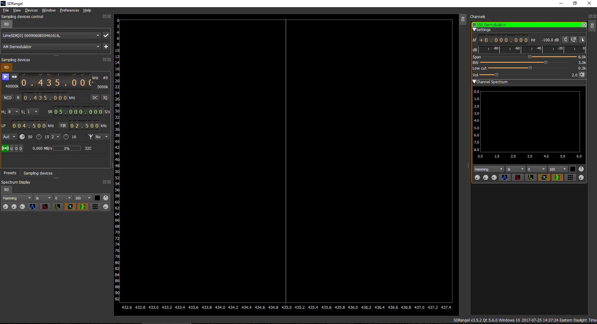 Hi, i tried to test the Lime with sdrangel, but i’am not able to start sampling. Is there a need for extra configuration of the limesdr to start sampling? Here is a screen shot from my PC. Or maybe some controls are missing?
