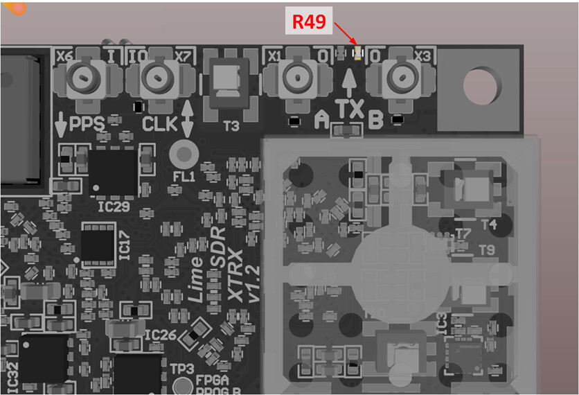 To visually identify the BOM version of a LimeSDR XTRX v1.2 board, check resistor R49 as shown in the picture below. If R49 is not populated, the board is BOM_VER = 1, indicating that the PERST circuit is correctly implemented and no further action is needed.